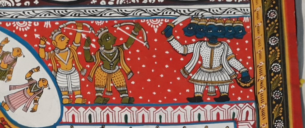 राम - लक्ष्मण एवं रावण युद्ध - रामलीला और कृष्णलीला से सम्बंधित अनेक चित्र जगन्नाथ मंदिर के साथ बने नाट्य मंडप की छत और दीवारों पर बने हैं , ठिया बढ़िया चित्रों में बनाया जाने वाला यह दृश्य उन्ही का प्रधिनिधित्व करता है। राम - लक्ष्मण एवं रावण के युद्ध का यह दृश्य चित्र के ऊपरे भाग में बांयी ओर बनाया जाता है। राम को नीले और लक्ष्मण को पीले रंग से चित्रित किया जाताहै।