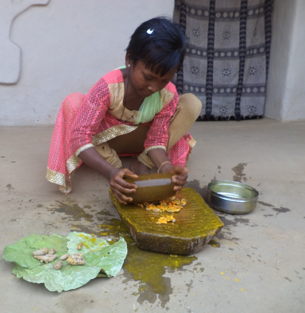 आकृति 10: कठपुतली विवाह के हल्दी संस्कार हेतु हल्दी पीसती बालिका।
