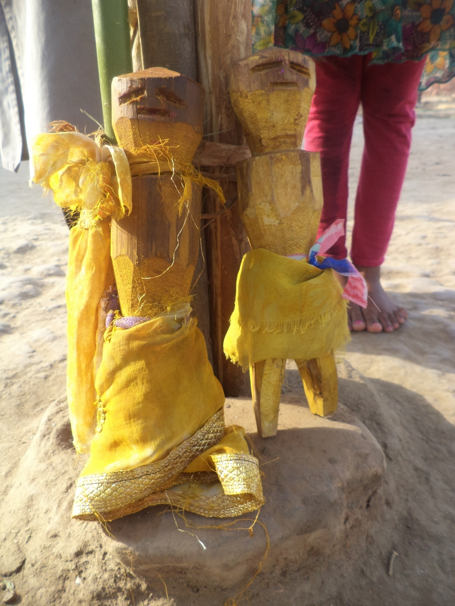 आकृति 12: कठपुतली विवाह के लये, गुड्डा-गुड्डी को कपड़े पहनाकर विवाह मंडप में हल्दी लगाकर रखा गया है।
