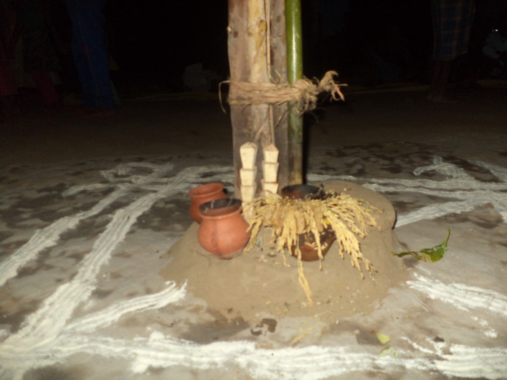 आकृति 14: कठपुतली विवाह के लिए, विवाह मंडप में मध्य में विवाह स्तम्भ खड़े किये गए हैं, अनुष्ठान हेतु कलस में पानी, धान की बालियाँ आदि राखी है और चौक बनाया गया है।