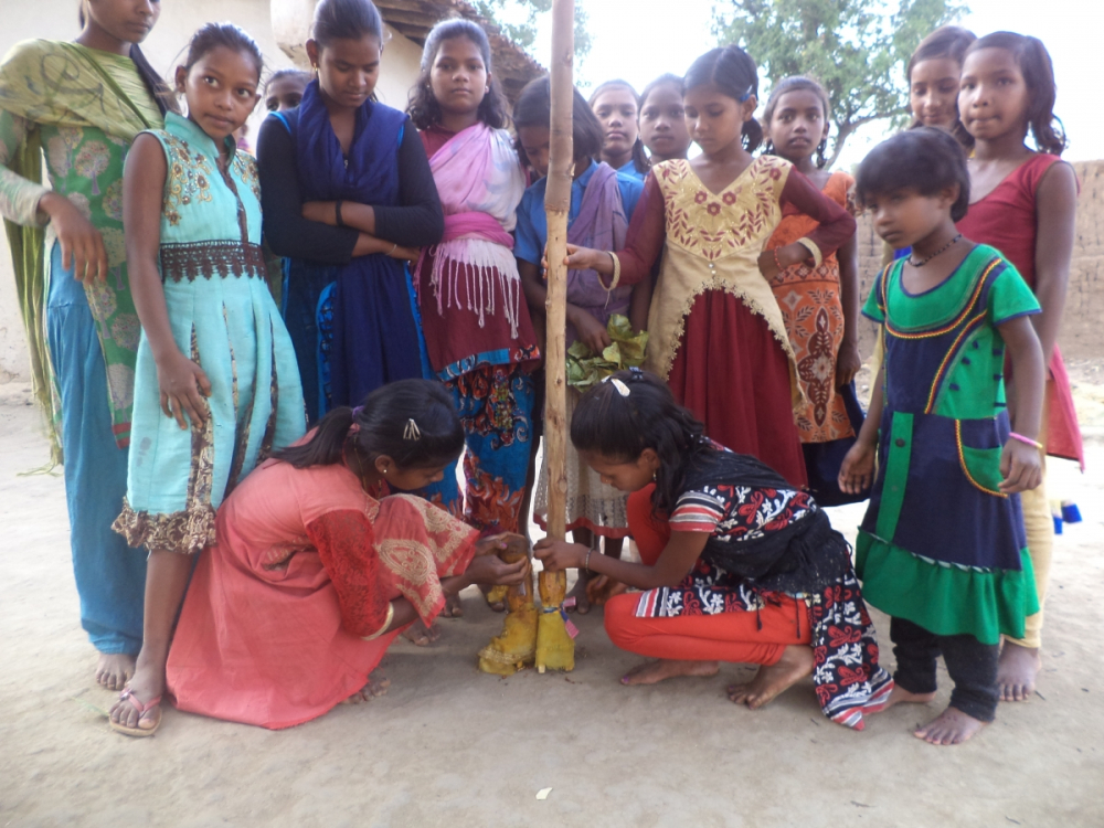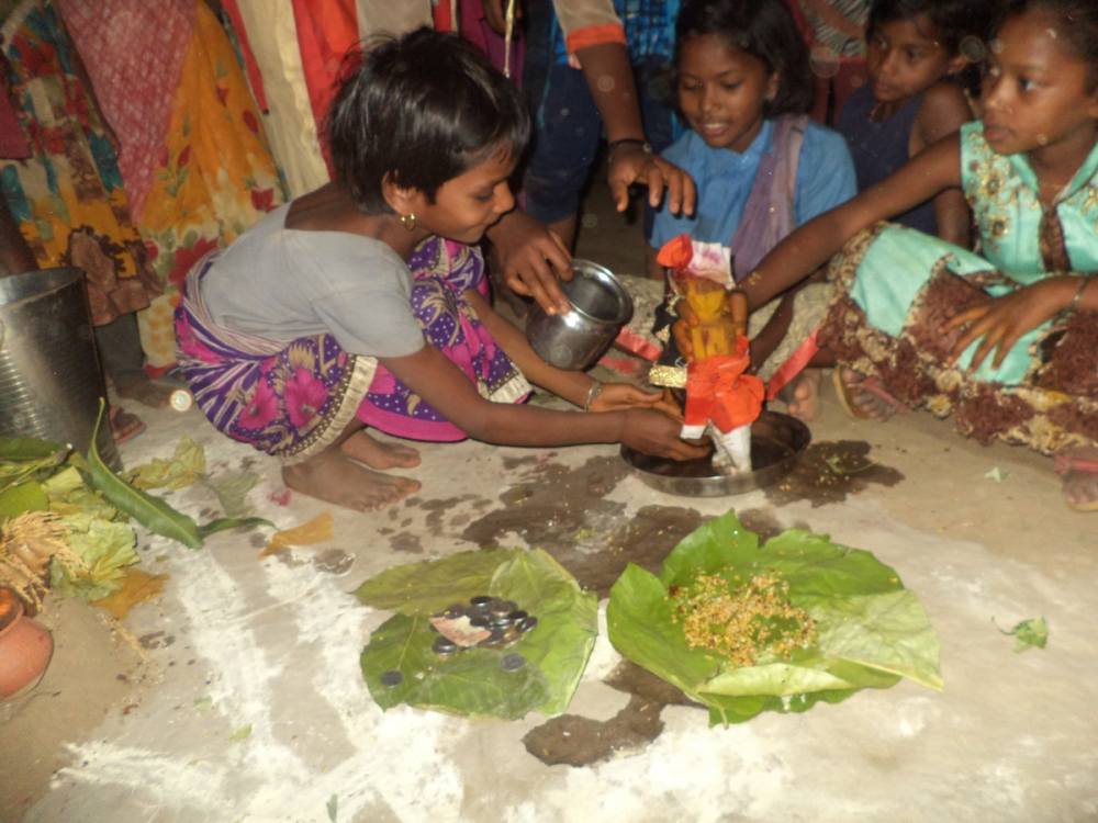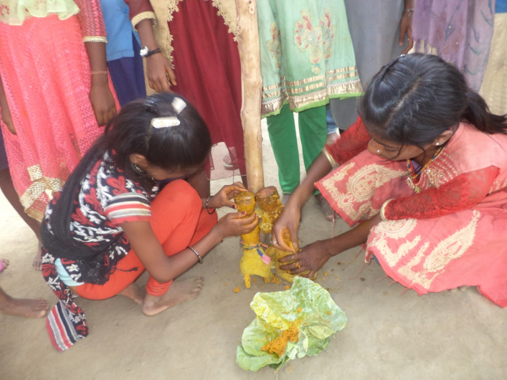 आकृति 16: बालिकाएं गुड्डा-गुड्डी को विवाह मंडप में हल्दी लगा रहीं हैं।