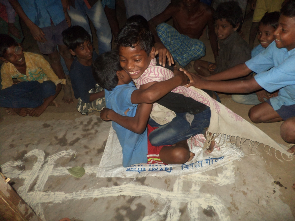 आकृति 19: कठपुतली विवाह संपन्न होने के बाद ख़ुशी में गले मिलते बच्चे।