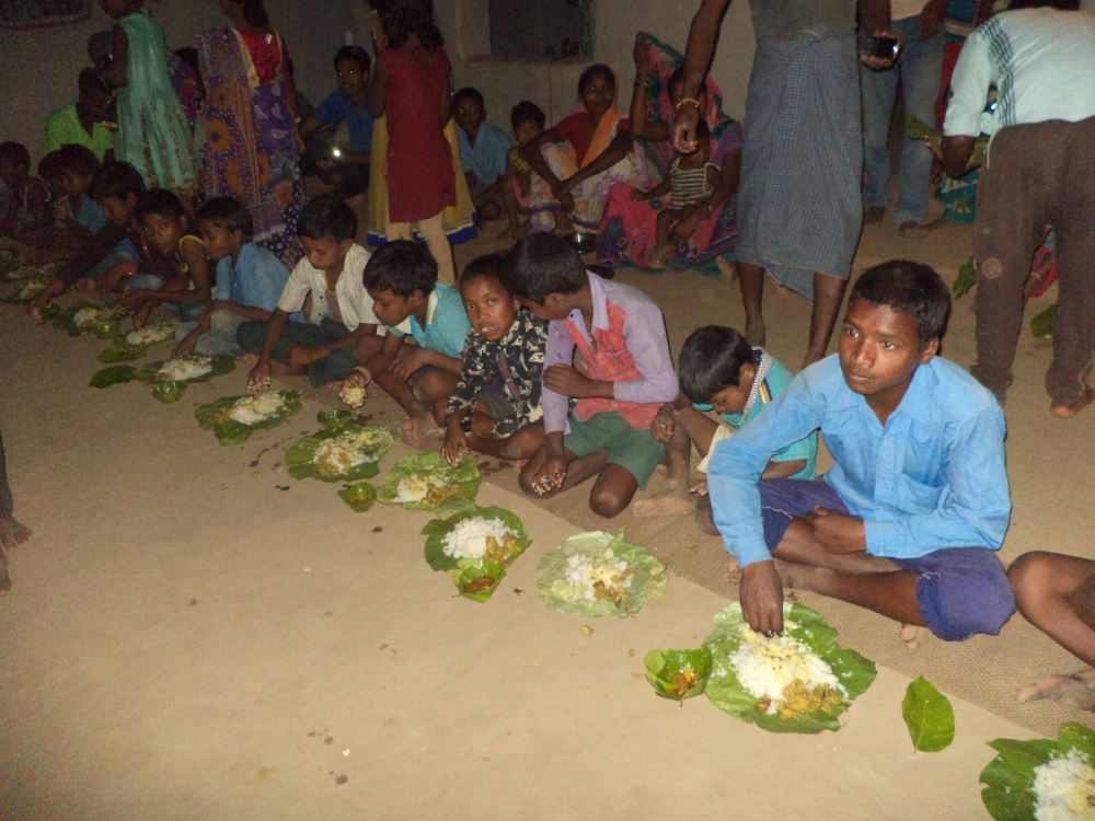 आकृति 22: कठपुतली विवाह के उपलक्ष्य में आयोजित सामूहिक भोज में भोजन कराते बालक-बालिकाएं।
