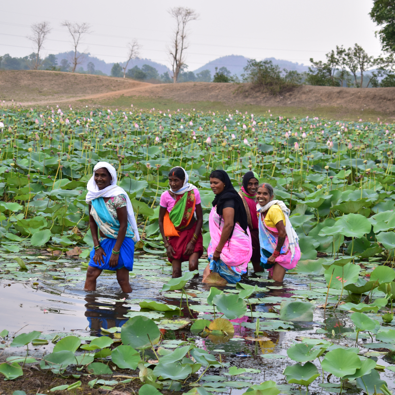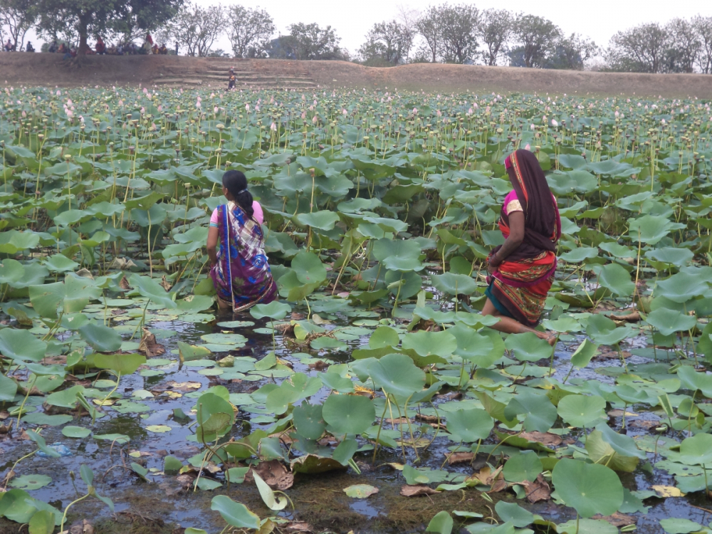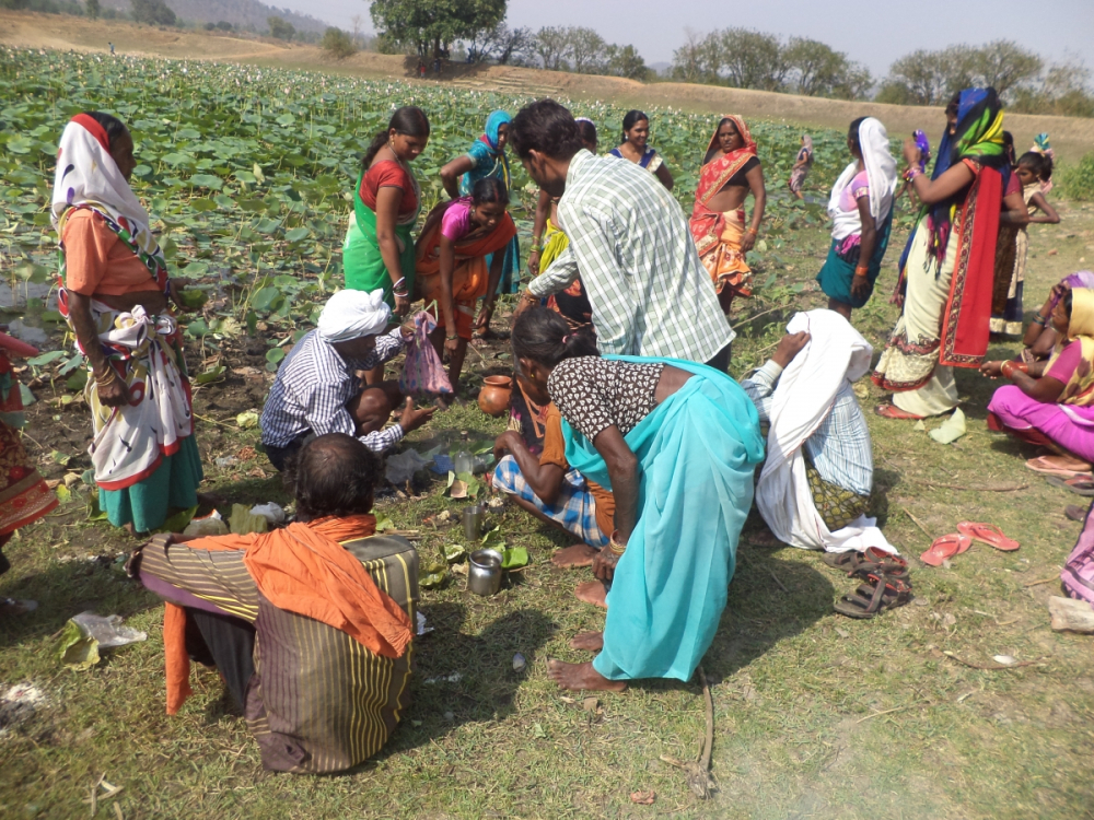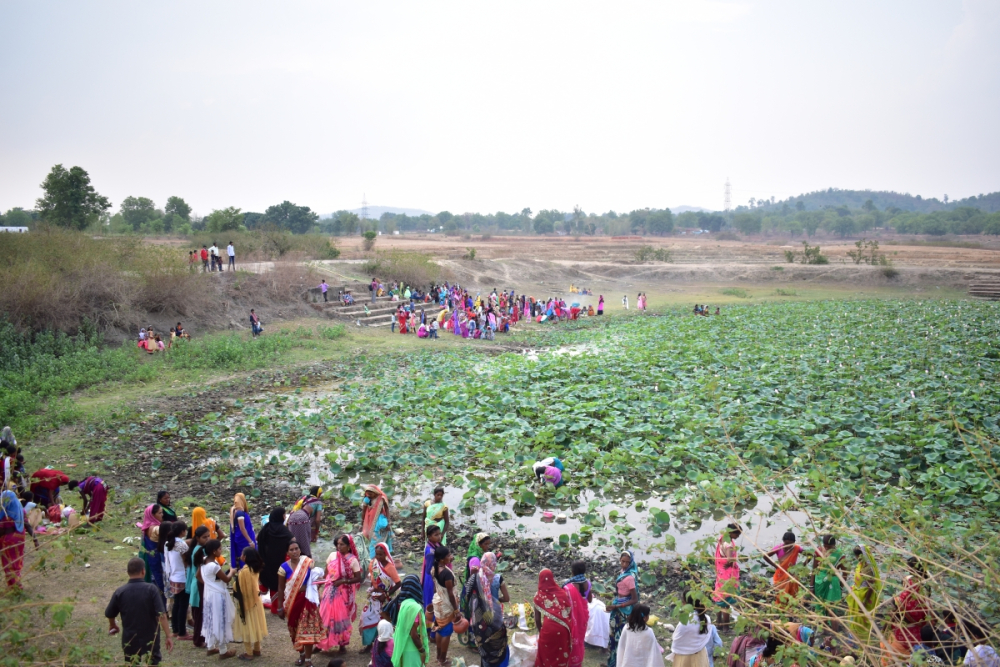 आकृति 3: कमल दल से परिपूर्ण साधु तालाब, ग्राम सरहरी पर गंगा दशहरा के अनुष्ठान संपन्न करने हेतु एकत्रित हुआ महिलाओं का समूह, सरगुजा