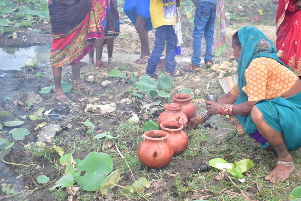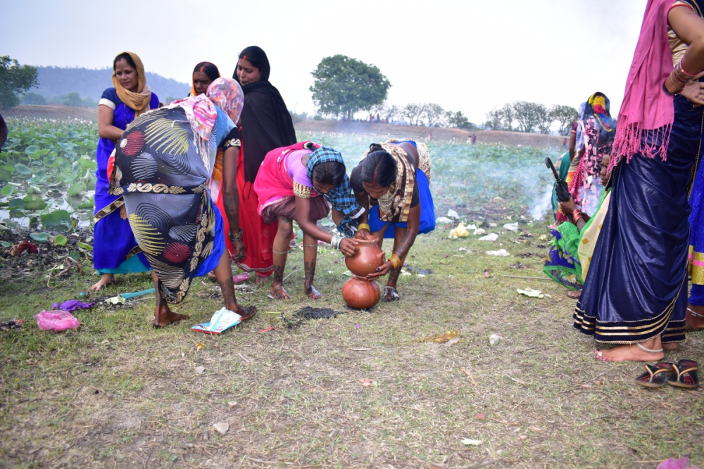 आकृति 4: साधु तालाब के किनारे अनुष्ठानिक कार्यों हेतु कलसा में पानी भारती हुई महिलाएं, सरगुजा