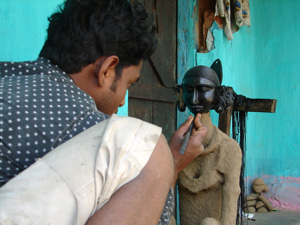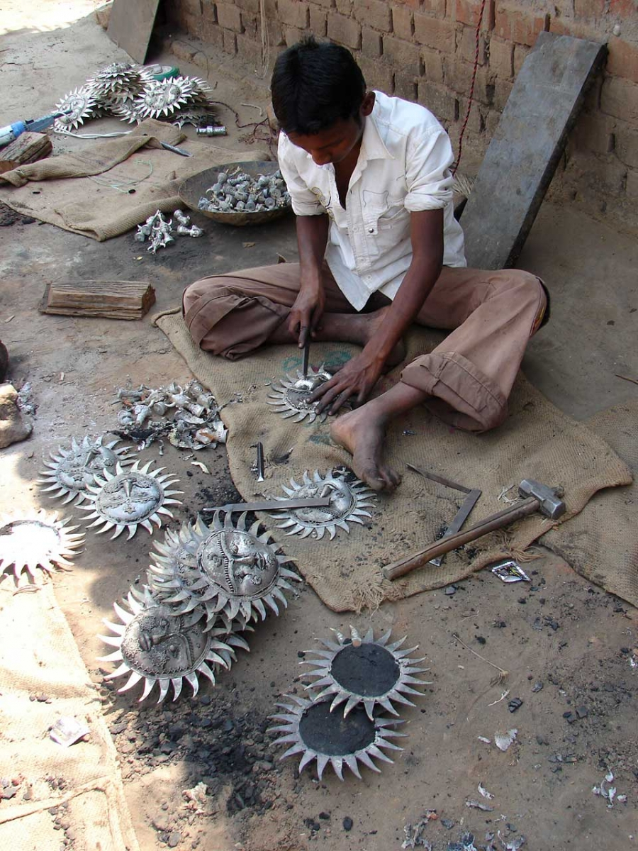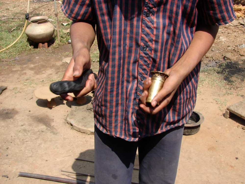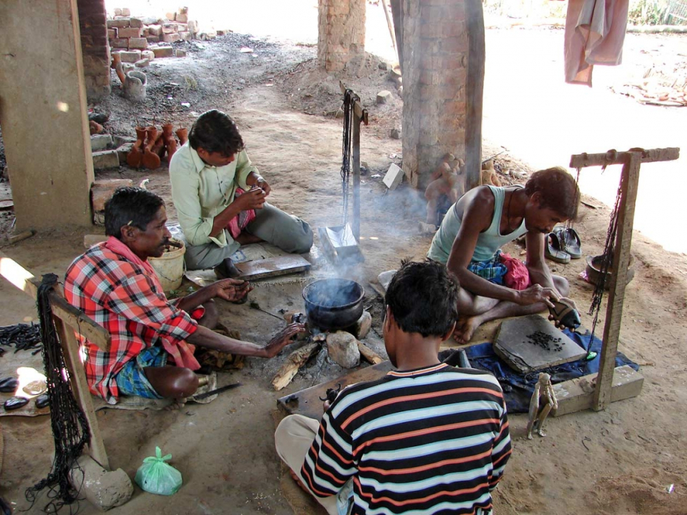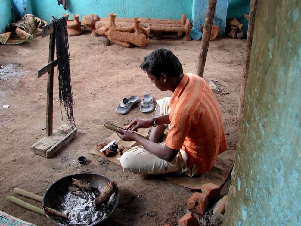 धातु ढलाई कार्यशाला में कार्यरत घढ़वा धातु शिल्पी।