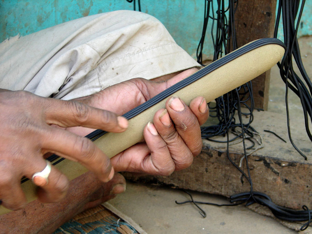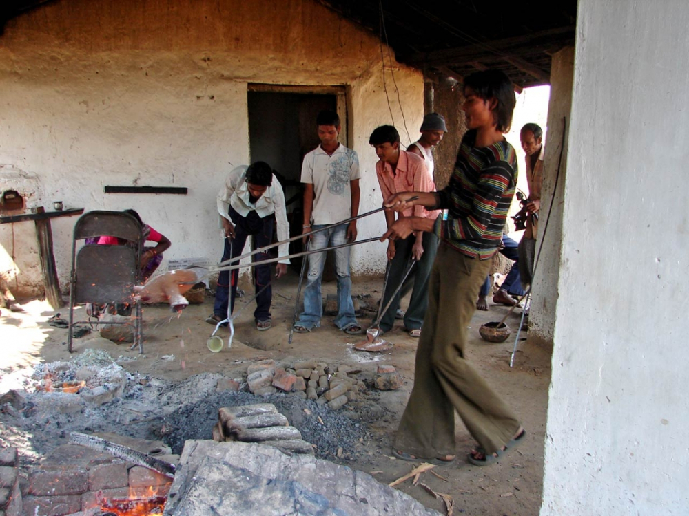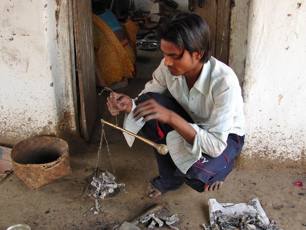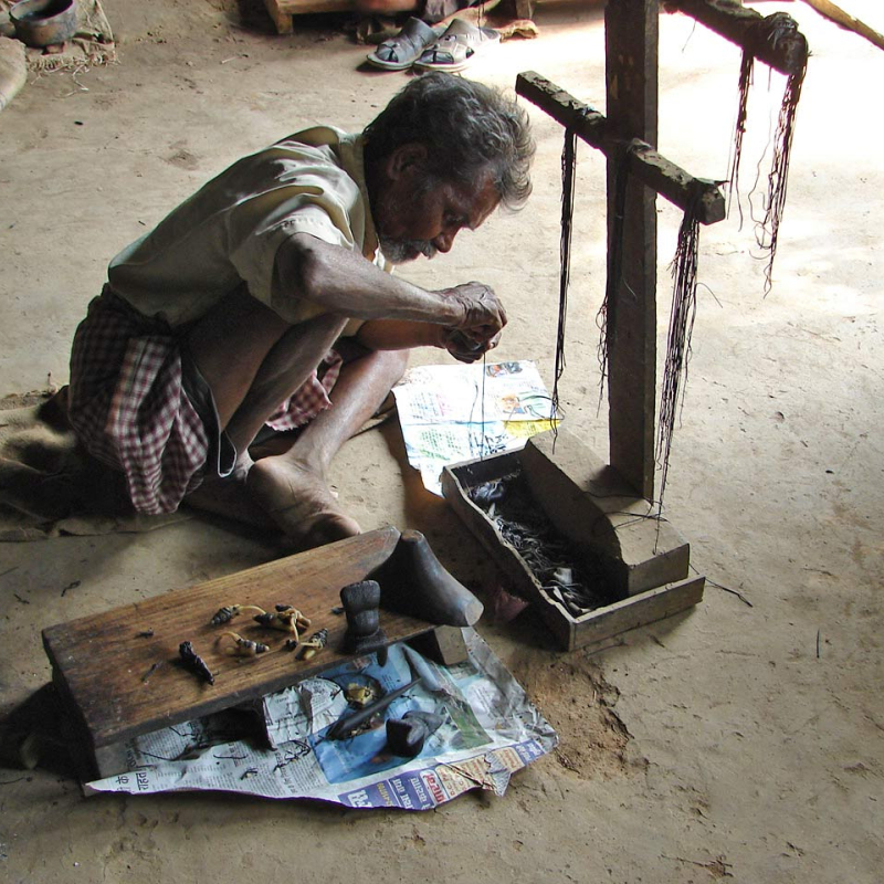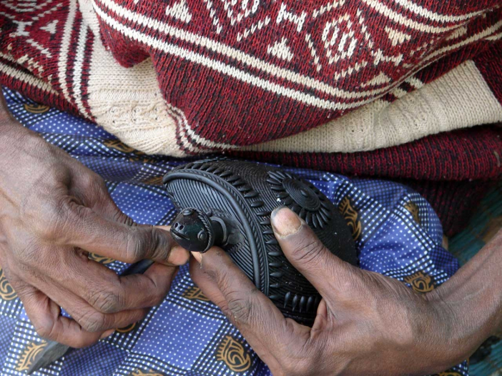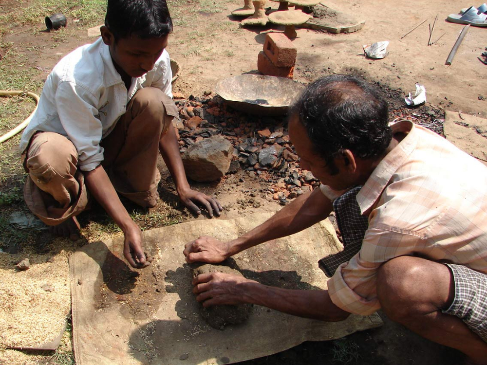 धातु ढलाई कार्यशाला में कार्यरत घढ़वा धातु शिल्पी।