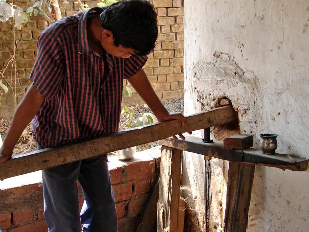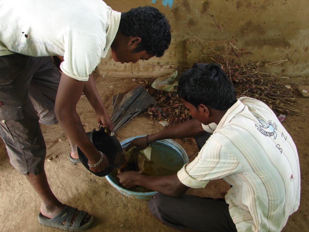 पिघले हुए मोम को सूती कपड़े से छानते हुए पानी भरे बर्तन में इक्कठा किया जाता है।
