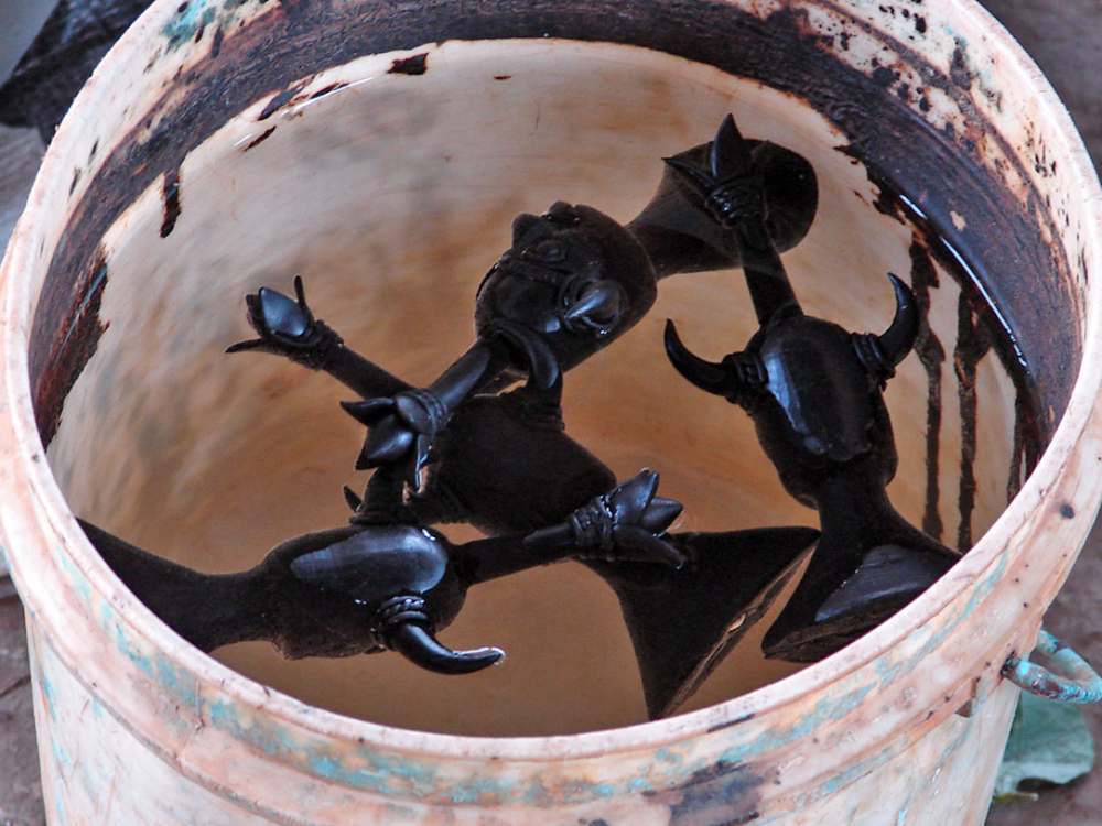 सांचे को भट्ठी से निकाल कर ठंडा करने से पीतल जम जाता है और मूर्ति तैयार हो जाती है ।