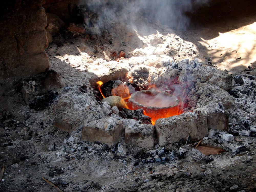 सांचे को भट्टी में रखकर गर्म किया जाता है जिससे मोम जल जाता है।