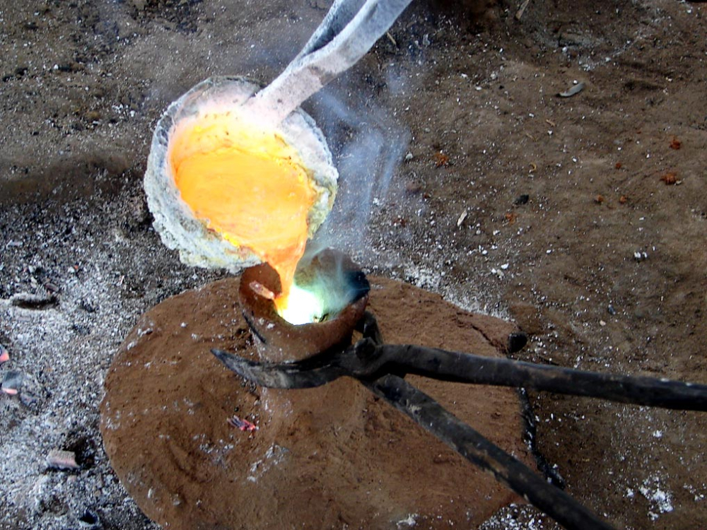 पिघला हुआ पीतल क्रूसिबल से गर्म सांचे में डालते हैं।