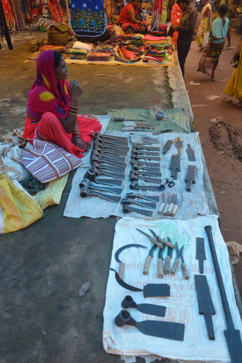 हाट बाजार में लोहे के बने कृषि उपकरण बेचती लोहार महिला (फोटो-२०१८)