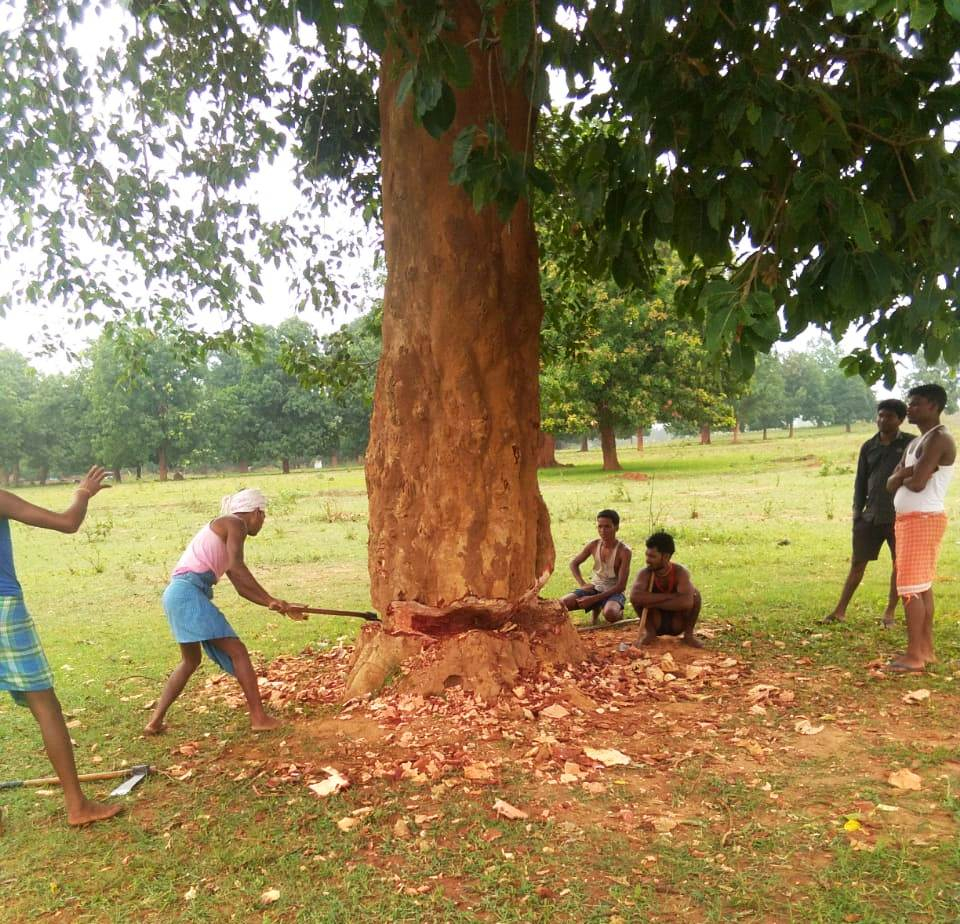 कुल्हाड़ी से वृक्ष काटता ग्रामीण (फोटो-२०१८)