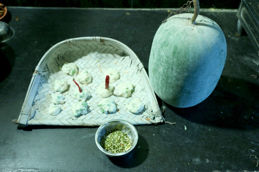 रखिआ वड़ी और उसे बनाने की सामग्री। कुमड़ा , मूंग की दाल।