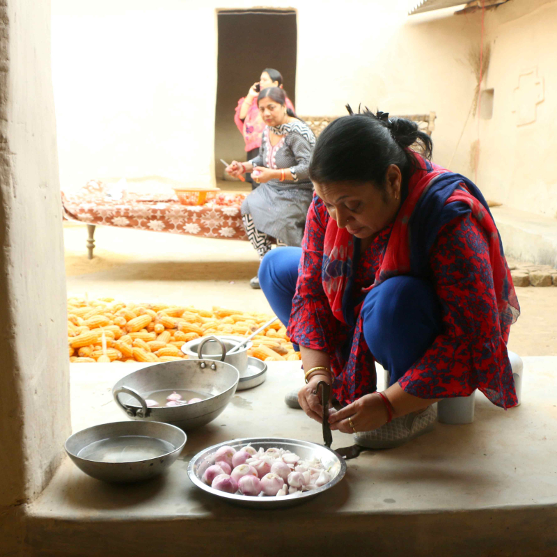 काम मे दिन में पन पियाऊ(lunch time, tifin)के लिए हाँथ की बनी मक्का,गेहूं,चना,चावल की रोटी चूल्हे में पकी,सेंकी साथ में टमाटर,लहसुन,कोई भी चटनी साथ लेकर जाते हैं।