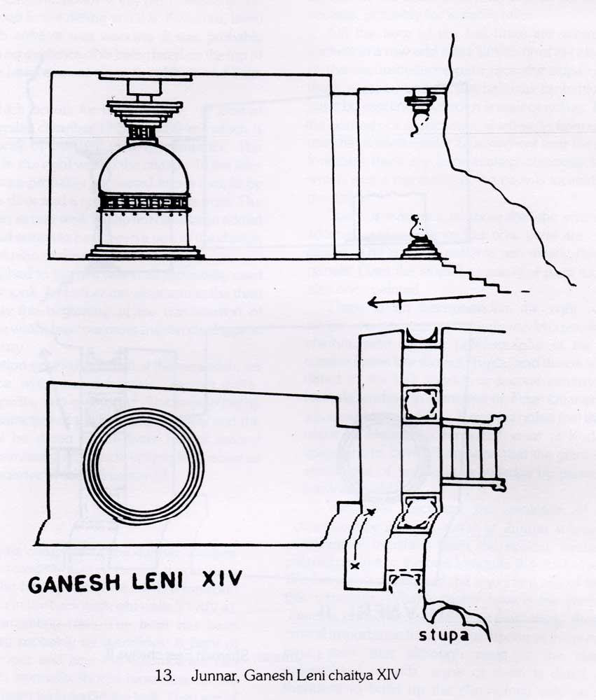 Further development takes place at Junnar which, with 105 caves, is probably the largest Buddhist complex, next to Kanheri, but dispersed in different groups. Here Ganesh Leni 6 is a standard chaitya conforming to the Hinayana plan but the chaitya arch is blind. This was not done deliberately but there was no alternative because of a loose stratum of rock. The same was the case with Amba-Ambika 26 of which the hall is not exactly apsidal but rather irregular. From this seems to have developed the quadrangular chaityas at Junnar, for instance, Bhimashankar 2, Ganesh Leni 14 (Figure 5), Shivaneri East 2 and so on. The apsidal and vaulted roofed chaitya now becomes quadrangular, astylar and flat roofed (Dhavalikar 1984, 12 ff.).