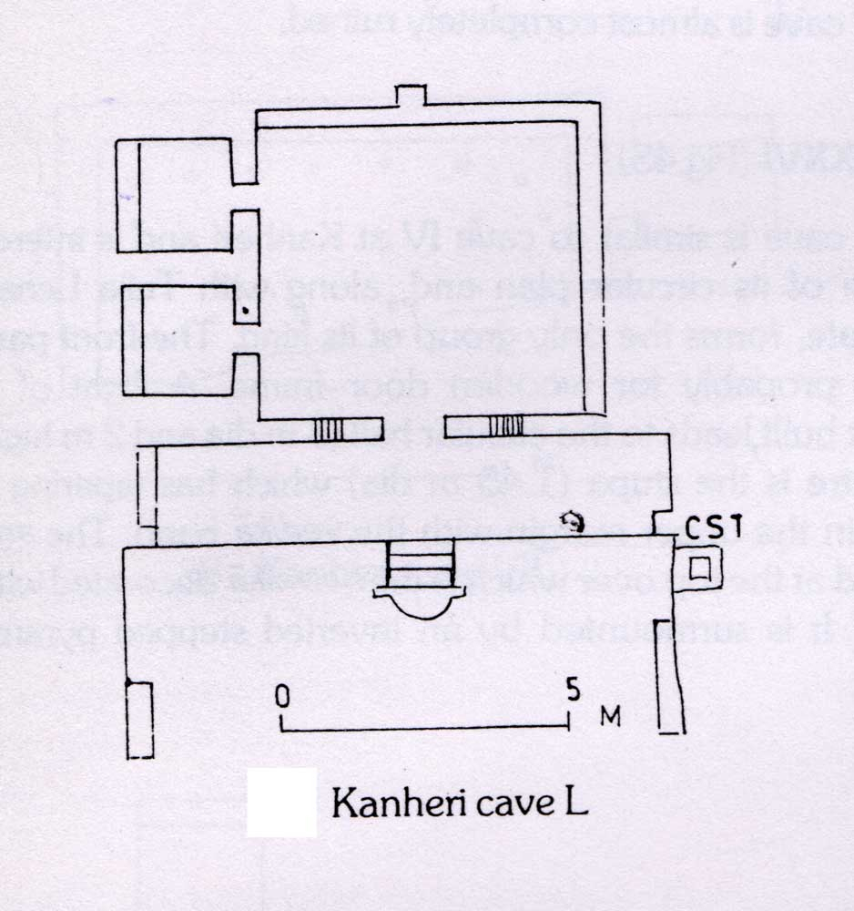 This cave (Figure 14) is absolutely unknown even to the scholarly world as it is completely in ruins and is used for housing generators supplying power to the site. According to Burgess it was a Hinayana excavation (Fergusson and Burgess 1880, 289) but the late Dr Suresh Vasant meticulously studied it and prepared its plan from whatever remains of it and assigned it to the Mahayana group at the site (Jadhav 1987). The cave consists of a hall (7.60 m sq., 3.5 m high) with three roughly square cells in side walls and two each flanking the shrine which has a bench or a platform in the rear wall. There are some early features in the cave such as its plan which is identical with Mahad 8 (Figure 12), and holes in the platform/bench in the shrine for fixing a loose image (of Buddha) which, as we have shown was already in vogue at Kanheri earlier. The veranda is totally ruined. The cave shares many features with Mahad, Kuda and Kanheri and may be assigned to the late third or early fourth century.