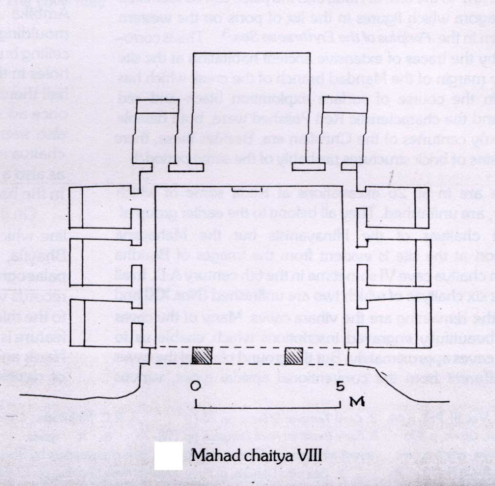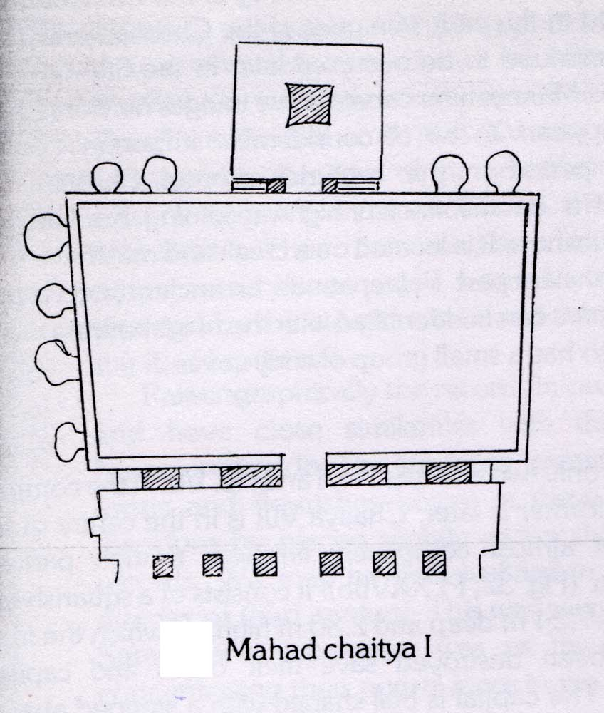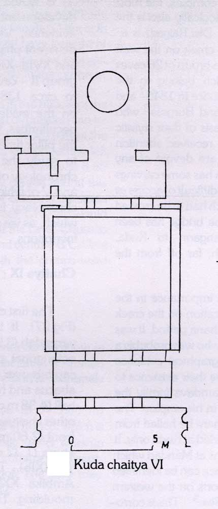 Considerable development took place at Kuda. Chaitya 9 is a quadrangular chamber with a stupa. It has a veranda with a cell with a bench on the left. Cave 15 is identical and has a room each at either end of the veranda. Chaitya 1 is like a temple with a veranda, a hall and a shrine joined to it by a vestibule (antarala). The development is complete in Chaitya 6 with the addition of benches on three sides of the hall (Figure 11). Cave 4 is similar but incomplete. The Kuda epigraphs end in deya-dhamma, the Hinayana formula.
