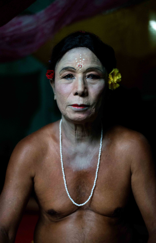 Much venerated for their knowledge and special powers, amaibis hold an exalted position in traditional Meitei society and they present a curious case of gender fluidity in the Manipuri cultural context. ‘Nupa’ means male while ‘amaibi’ is a feminine term which shows a certain gender nonconformity in the name itself. They trace this ambiguity in the concept of ‘pa’ and ‘pi’. According to this philosophy, the world of the living beings is the world of two: the pa (as in amaiba, with ‘ba’ being the later evolution of the ‘pa’) and pi (as in amaibi, with the ‘bi’ sound being the later evolution of the sound ‘pi’). The Lord of the Universe, with their hair lock in front is the Supreme Pa, Lainingthou (king of gods, identified as a masculine entity), and with their hair lock at the back is the Supreme Pi, Lairembi (supreme female deity). The one Supreme Being can thus be worshipped as Lainingthou or Lairembi or both together. This gender fluidity is exemplified in the nupa amaibi. According to the nupa amaibi themselves, they look like a man from the front and like a woman from the back, and when someone call them ‘epa’ (father) they reply ‘hao’ (affirmative response) and when they are called ‘ema’ (mother), again, they reply ‘hao’.