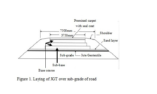 In all the field applications in roads, it has been observed that sub-grades, despite being expansive, experienced increase in CBR in the range of 1.5 to 3.0 times the control value. As soil consolidation is a time-dependant process, with the passage of time CBR shows a sustained rise even after a period of eight or nine years (Sridhar 2015:59). Void ratio and compression index of the sub-grade soil registered a downward trend while its dry density increased. In most of these road applications, woven JGT with a tensile strength of 20 kN/m to 25 kN/m were used. Busy and heavy roads may call for the use of woven JGT of higher tensile strength (30 kN/m and above) (Sridhar 2015:59). The schematic diagram of installation of JGT in road construction is shown below in Fig. 1.