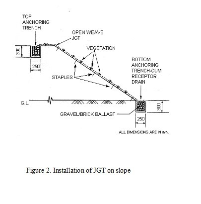 Open-weave JGT was used to stabilize slopes on hills and embankments followed by the creation of vegetative cover that protects the slopes from destabilization on bio-degradation of JGT. In almost all case studies, the yield of vegetation improved by around five times the usual yield (Kg per ha.) after three years of plantation. Moisture conservation, reduction of the velocity of surface run-off and quality improvement of soil were in evidence in all the applications. The extent of improvement of soil character depends on selection of the vegetation, soil type and climatic features. The choice of open-weave JGT (500 gsm or above) depends on the amount and intensity of precipitation and slope inclination. The schematic diagram of installation of JGT in slope stabilization is shown below in Fig. 2.