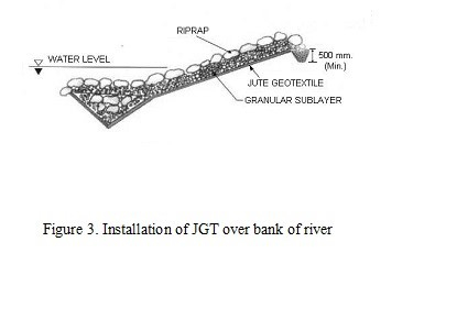 Woven JGT smeared with bitumen (90/15 grade) was used in all applications related to erosion control in river and waterways. This was done with a view to protecting JGT yarns from direct exposure to water. Moreover, time of bank soil consolidation in river depend on the nature of flow (two-way or one-way), existence of vortices at the toe of the bank slope and other hydraulic factors. In the tidal reach of a river (e.g., the Hugli in West Bengal, India), mangrove plantation was attempted to reinforce the strength of the bank soil through its roots. In non-tidal reaches (one-way flow), usual boulder rip rap was used. The schematic diagram of installation of JGT in river bank protection is shown below in Fig. 3.
