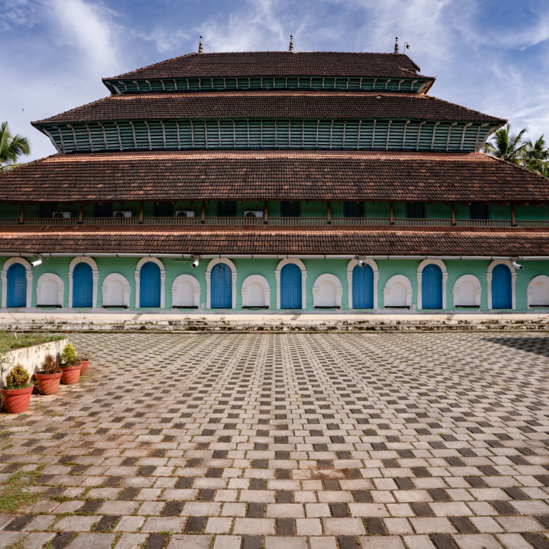 The Mishkal Mosque in Kuttichira is an iconic structure in the Indo-Islamic architectural style, with a legacy spanning over 650 years. Built by Nakhuda Mishkal, an Arab trader, the mosque was originally a five-storeyed structure made of timber. Following damage during a Portuguese invasion in 1510 CE, the mosque was reconstructed as a four-storeyed building. Rather than featuring a dome and minarets in the traditional Islamic style, the building is characterised by multiple-tiered gables and the signature tiled roofing common in the region’s architectural tradition. Its 47 doors and 24 carved columns showcase the craftsmanship of local artisans. The gopuram-style semi-circular arches and wooden carvings further highlight this fusion of Hindu and Islamic architectural elements to form a new architectural idiom exclusive to the region. Another example is the thirteenth-century Muchundi mosque in Kuttichira, which features a double-tiered roof with floral woodwork, carved wooden pillars and a decorated gable.