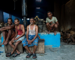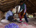 I visited Pragati Aroma Factory to experience the hydro-distillation process. The process itself is rather straightforward but the factory environment was fascinating with its interplay of light, shadows and human labour. The first step involves plucking and sorting of flowers, usually done early in the morning. The flowers must be distilled the same day, before the natural fragrance fades away. They are poured into copper vats (degs), which are sealed with a kind of smooth black mud. A kamani (plate) is added on top of the deg and locked by a wooden log (phaniya) to tightly seal the lid. Each deg is permanently fixed over an open furnace fired with dung cakes or wood. During steaming, fumes (bhap) pass through bamboo pipes (chonga) and are condensed in pots (bhapkas) that are water cooled. No electricity is used in the factory and the hot and humid environment makes it a very oppressive place to work. The extreme temperatures in the furnaces heated up my cameras, causing them to malfunction and difficult to hold at times.
