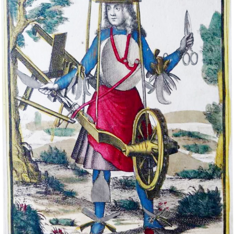 In the same lot, and certainly acquired at the very same time, is another engraving—also clearly French as can be ascertained from the caption below—featuring a man virtually armed to the teeth, not because he is a soldier, but because he plies a trade which he advertises through what he wears and what he carries: an extraordinary range of objects, including knives of all shapes and sizes and scissors of different kinds which he has tied to all parts of his body, from hands to elbows and from knees to ankles. He is, as the French caption explains, a ‘remouleur’, ‘grinder’ in other words, who moves from village to village, even from house to house perhaps, offering to sharpen, and grind into shape, old but blunted knives and scissors. One recognises the trade, for itinerant grinders used, at least once, to be a common sight in our land too, but the manner in which the man is accoutered, and the apparatus with a wheel, with a part of which he covers his head like a helmet, must have presented an astonishing sight to the Indian collector who acquired it. One might have been tempted to regard this as an arresting French engraving with no connection to India, but, once again, as in the case of the image of the Duc de Vendome, on the top margin of the engraving is a caption, in Devanagari script. The one word inscription simply reads, ‘sikligar’, the word used to identify in our land, especially in Rajasthan, persons who worked with metals, particularly those fashioning vessels and weapons like swords and daggers. A chord must have been struck.