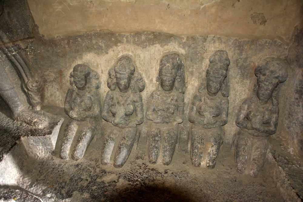 The saptamartrikas carved on the left wall along with Virabhadra include Brahmani, Maheshvari, Kaumari, Vaishnavi, Varahi, Chamunda and Durga (Sahai 1975).