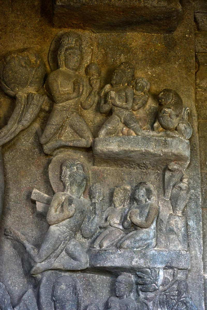 There are figures of kneeling devotees carved inside the shrine–five male devotees to the left, and five female devotees to the right (Fig. 16). However, this group of figures lack the energy, life-like vigour and realism seen in similar figures carved in the shrine of Cave 3. The work is of inferior quality.