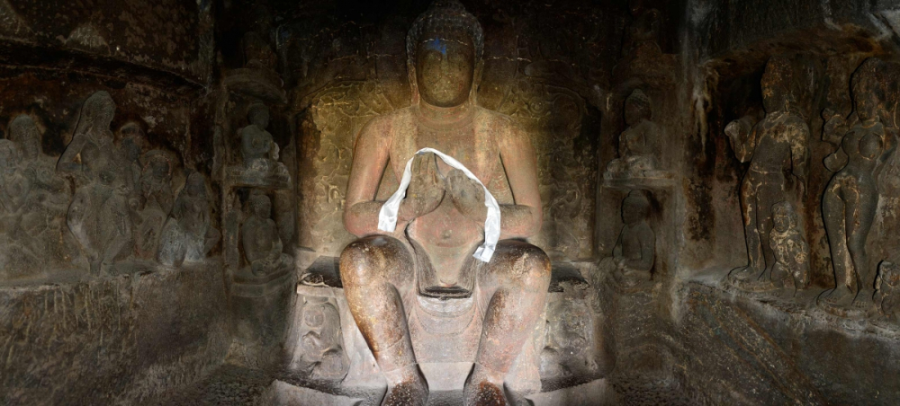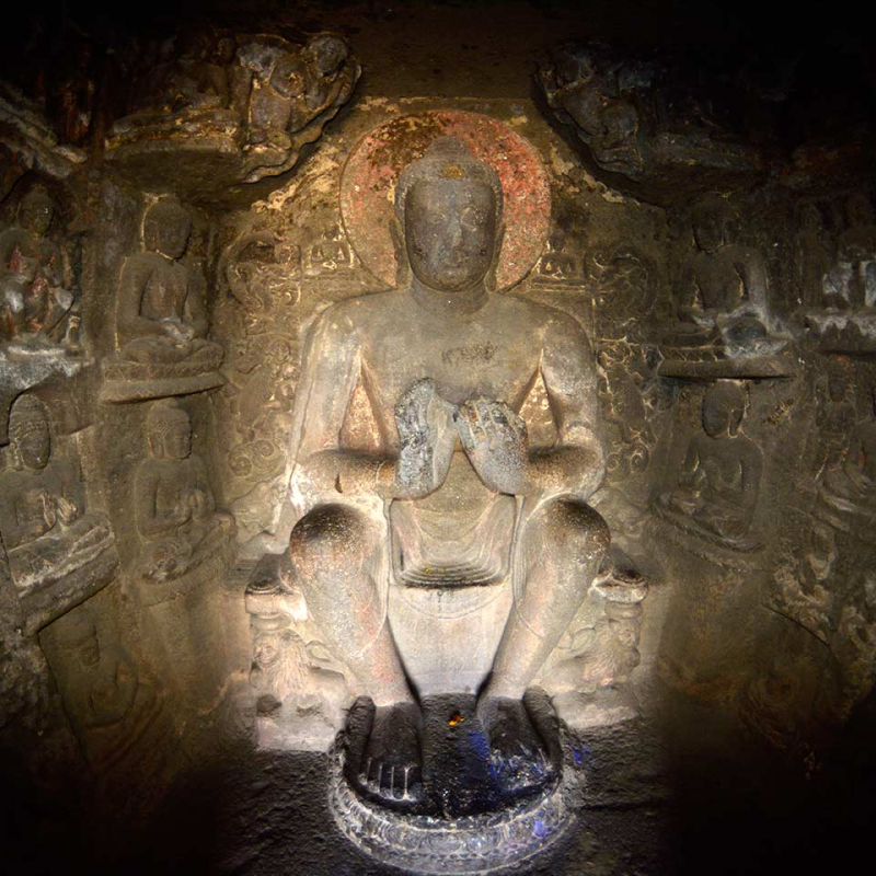 At Ajanta, in Caves 1 and 16, the image of Buddha can be circumambulated, but the main shrine is attached to the back wall. In Cave 5 of Aurangabad the image of the Buddha is seated in padmasana with his hands in dhyanamudra. On his right is Vajrapani, and on the left Padmapani. The Buddha is seated on a rectangular pedestal, instead of the usual lotus pedestal, and there are none of the usual side images of elephants or dragons. That is why many mistook it to be a Jaina cave.