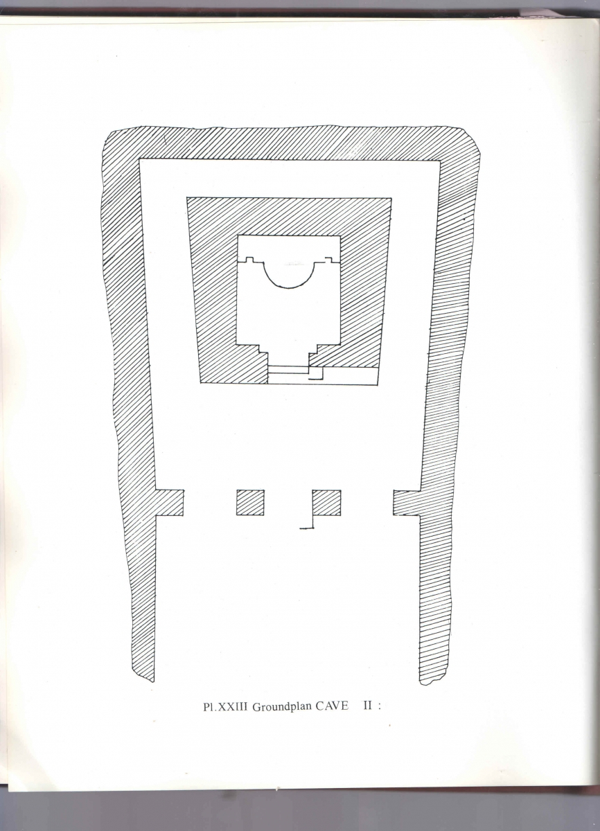 The first cave with a shrine isolated from the back wall, this was probably a bigger cave, with cells on both sides of the now ruined veranda (Fig. 12). This cave appears to be extremely crude. It was probably the first attempt at a new form. The artists were not too sure of themselves, as is obvious from the nature of the carvings, and their immature and unrefined forms. None of the other caves are so crude.