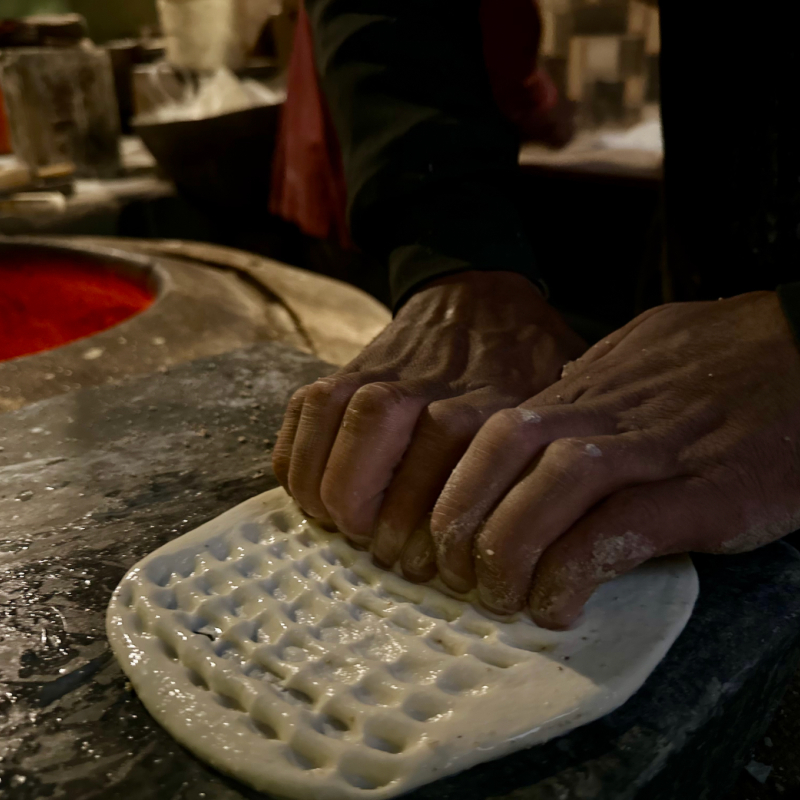 First thing in the morning, an apprentice retrieves apricot firewood for the tandoor and sweeps the shop, while a baker kneads the dough in a large copper pan (taev) for morning breads like girda, lavasa and gyev tschot. After a resting period, the dough is weighed digitally and rolled into uniform palm-sized balls. These are then arranged in rows on a sturdy wooden board (takhte) and covered with a damp cloth (tarpoosh) to maintain moisture. The dough is then flattened on a marble slate (devri), the baker occasionally dipping his fingers in milk before creating indentations on the surface of the dough. As the bakery slowly comes to life, the master baker (vaste) applies the flattened dough to the internal walls of the tandoor using either hand pressure or a cushion-like pad (ribde). Meanwhile, another baker, sitting cross-legged over the tandoor, adjusts the bread’s position with a hooked rod (seekh) and spatula (ramme) to ensure even baking. Firewood is managed using larger variants of these tools. Coals are removed using a T-shaped implement (narkash) to fuel the secondary oven (matte) or to provide heat for visitors’ clay fire pots (kangris).