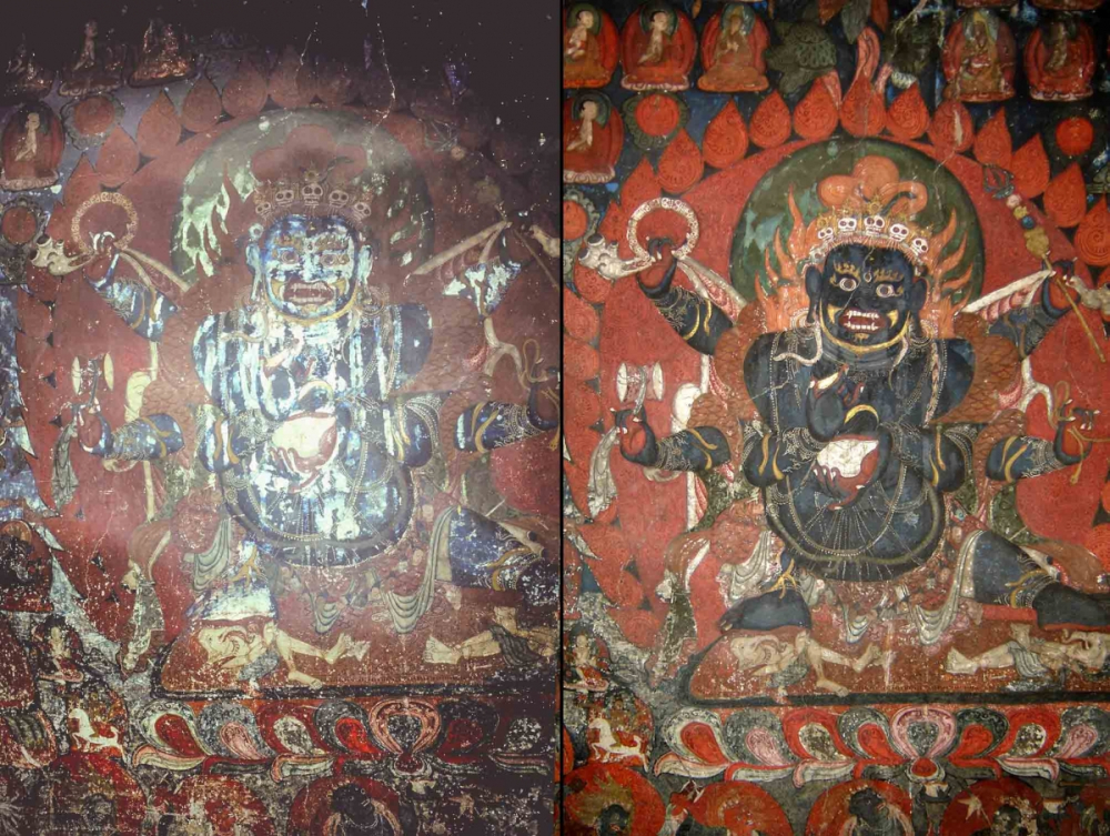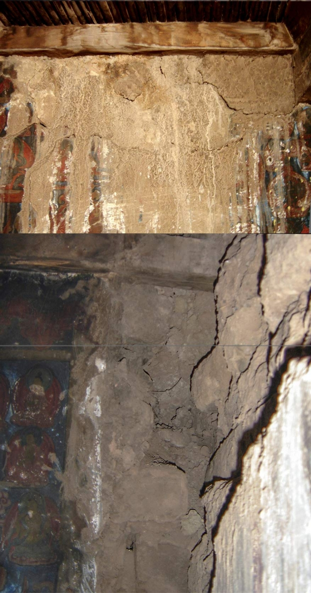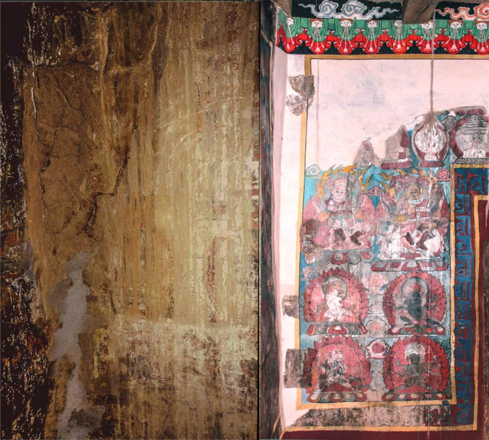 Fig. 9a: West wall, Chamba Lhakhang before conservation. b: West wall, Chamba Lhakhang after conservation. (Photo Courtesy: Sanjay Dhar)