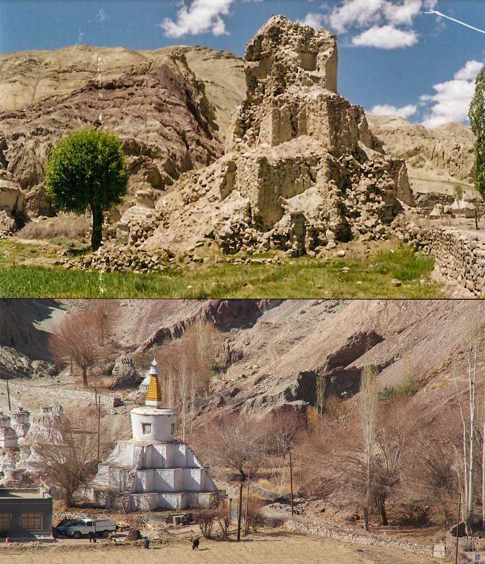 Fig. 6a: West face of Chamba Lakhang; the foundation of the temple is exposed due to erosion; parts of the temple wall damaged due to water seepage (before). (Picture Courtesy: Tsering Angchuk). b: The same area after the retaining wall has been completed and after architectural conservation. (Photo Courtesy: Sanjay Dhar)