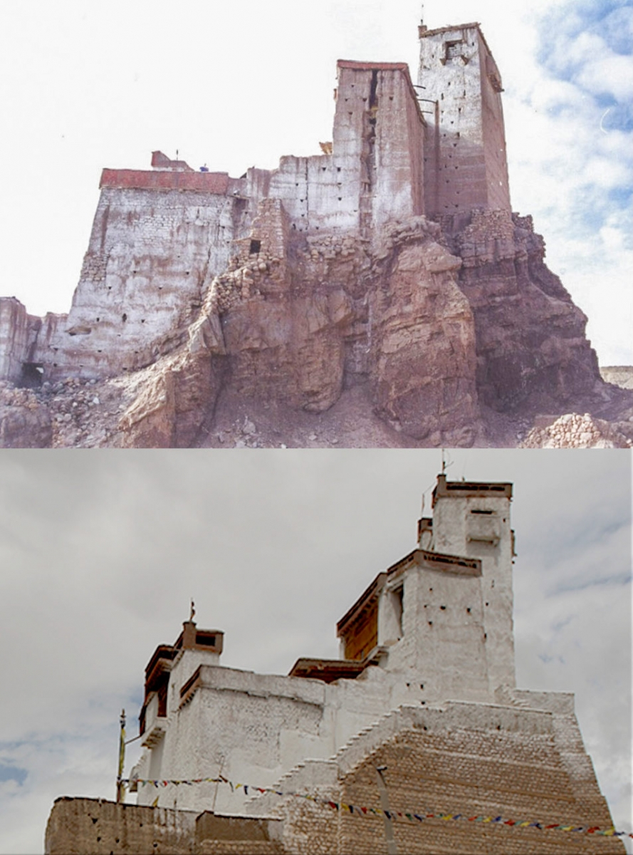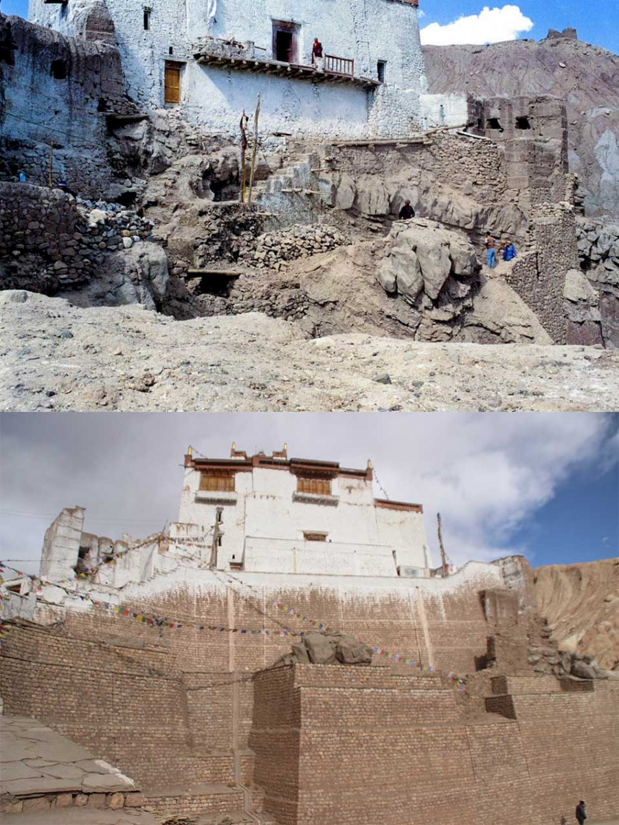 Fig. 5a: South face of Chamba Lakhang; the access to the Chamba Lakhang was precarious with the crumbling rock foundation (before). (Picture Courtesy: Tsering Angchuk). b: The same area after the retaining wall was completed. (Photo Courtesy: Sanjay Dhar)