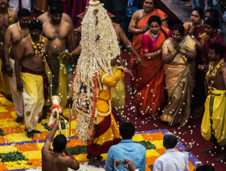 The last day of the festival is synonymous with the joyous welcoming of the spring when the men playfully try to break coconuts filled in a gunny bag hung at a height while turmeric water is splashed at them. The flag raised in the beginning of Karaga festival is lowered at midnight of the last day; the end of the year’s festivities is marked by the immersion of the karaga in Cauvery River.