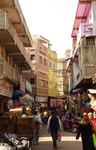 Walks through the Jamalpur kite market in the old city of Ahmedabad reveal that, much like its multiple meanings, the tangible representations and manifestations of Uttarayan are also varied. During the days preceding Uttarayan, the kite makers set up their seasonal workshops in the narrow lanes of the old city. Houses turn into workshops and thresholds into areas for displaying kites. Innermost and ‘in-between’ spaces within pols, or settlements, are adapted into spaces for stacking and storing kites. However, with the advent of small-scale kite markets and stalls in newer parts of the city, markets in the old city are found to be considerably less crowded than they were a few years ago.