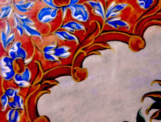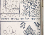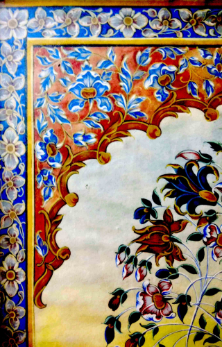 Bhai Gian Singh Naqqash's forte included motifs of painted seasonal local flowers that are either part of dehin in Mohrakashi or arrangement of flowers, leaves, Creepers or bushes surrounded with grapevine or Arabesque floral pattern in corners, square and rectangle forms. His fluidity and consistency of lines and intricate drawings are present in miniature paintings as well. Before the mohrakashi patterns are executed, the designs or patterns are made on paper and then transferred on to the wall. The compositions are an extension of the sketches or drawings that he paints on the wall. The compositions need to be of exact proportions and scale as required on the wall. The stencil is a khakaa, an outline of the motif made by perforating paper with a needle based on the pattern. It is likely that the original painted miniatures were done on paper and then a stencil was prepared from them.