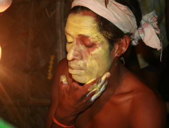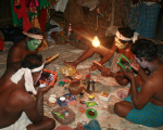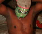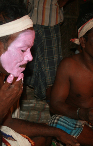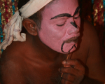 This image gallery presents a photo essay on the Koothu make-up, costumes, their styles and the methods of acting. Koothu or Therukoothu's acting style involves rotating rapidly, rolling the eyes, sticking out the tongue and vigorously dancing. The dialogue alternates between singing and speaking. Koothu's make-up and costumes greatly facilitate its style of acting and help the audience to understand the nature of the characters. While the colour scheme and symbolism of Koothu make-up are shared with the other South Indian performing arts, minor regional variations exist.