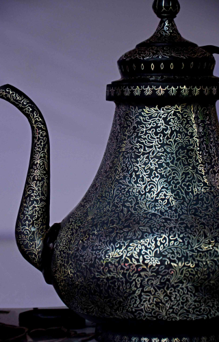 It is cast from an alloy composed of around 90 per cent zinc with smaller amounts of lead, copper and tin. The object is then incised with decorative floral or geometric motifs. The grooves are inlaid with silver and sometimes brass in sheet (taihnishan) or wire (tarkashi) to form a flush surface. The alloy background is then covered with a paste containing sal ammoniac, among other ingredients. The combination is polished together to give it a black sheen.