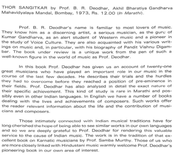 Review of Prof. B. R. Deodhar's book Thor Sangitkar (Bombay: Akhil Bhartiya Gandharva Mahavidyalaya Mandal, 1973)