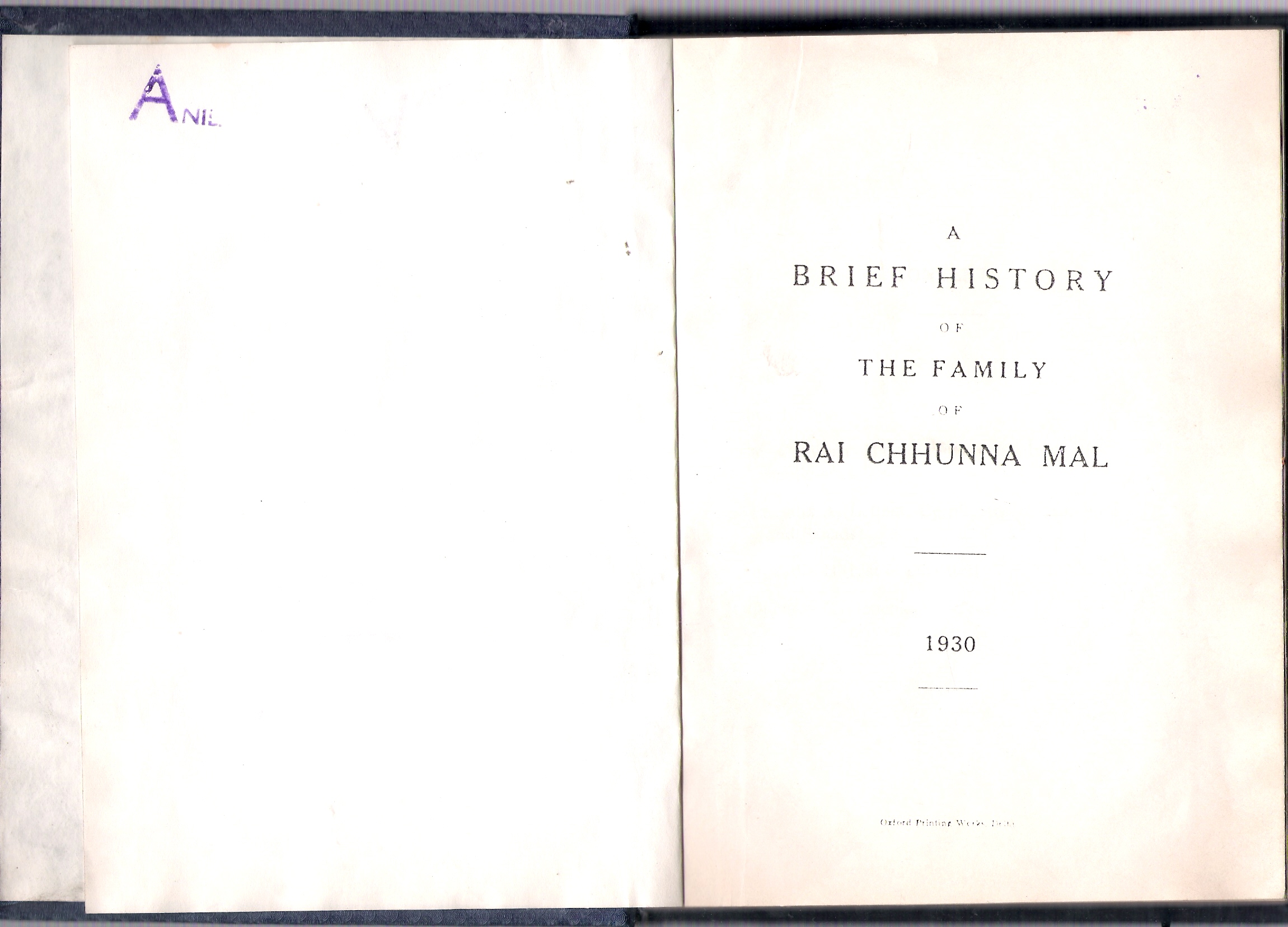 A book on the history of the family of the first Municipal Commisioner of Delhi, Rai Chunnamal, often referred to as 'Rai Sahab'. The authorship of the book is credited to Lala Radha Mohan and it was published by Oxford Printing Works, Delhi in 1930.