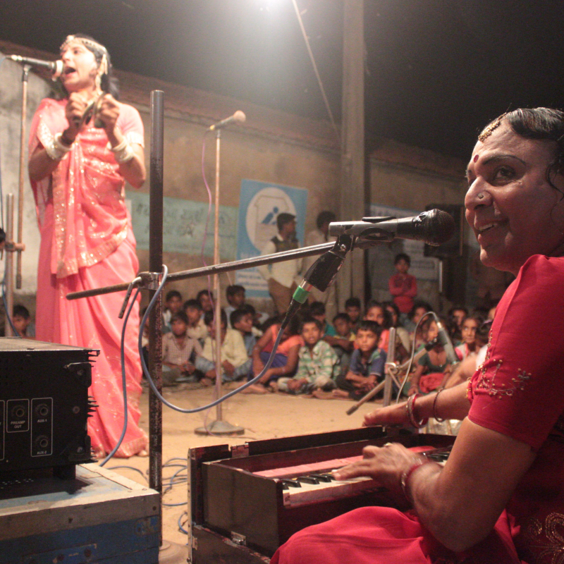Traditionally, boys became involved with their clan’s Bhavai troupe at around eight years of age. They started by accompanying the troupe to performances and observing them. Their initial work with the troupe included running errands, fetching tea and beedi, sewing costumes, arranging wigs, helping actors get ready, etc. At night, they observed the senior actors perform. During the day, they practised dance steps and songs. Those who showed proclivity towards performing were given bit roles to enact. Others were encouraged to master musical instruments. Those not adept in the arts were assigned organising and management tasks.