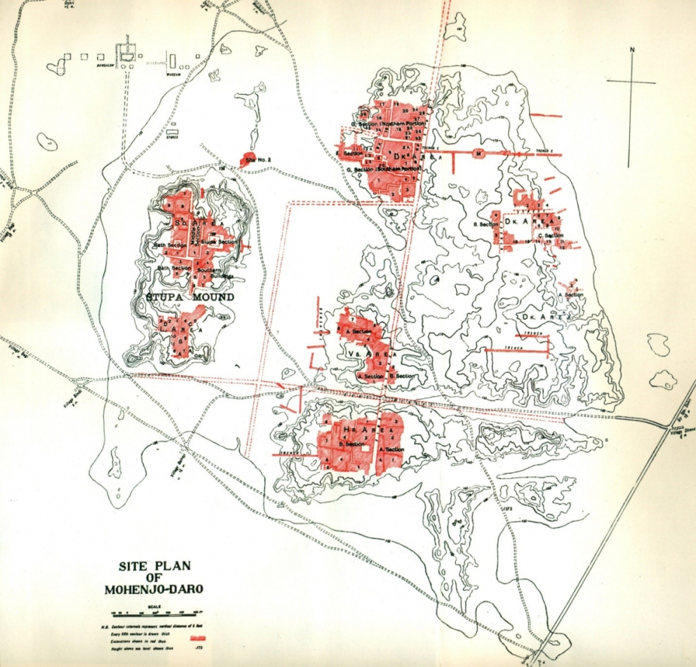 Figure 3: The Two Mounds at Mohenjodaro. Excavated Areas are shown in red