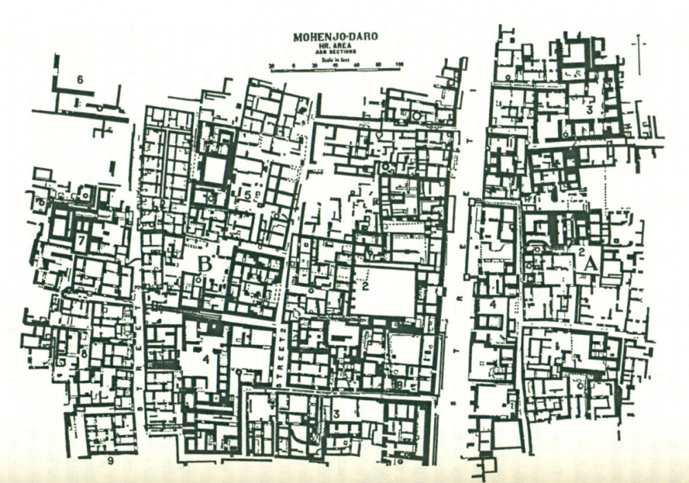One of the most distinctive features of Harappan cities is that they were divided. This division could result from separating and walling off parts of the settlement from others, or sometimes by internally building walls in a compact settlement.  Both seem to be deliberate attempts to separate either functions or people or both. Mohenjodaro provides the clearest evidence of a divided settlement of the former kind (Figure 3). There are distinctly two mounds, one, a smaller (about eight hectares) and higher one to the west and the other, a larger (about 115 hectares) and less elevated one to the east, both separated by an area of about 150 meters. These were termed as ‘Citadel’ and ‘Lower Town’ respectively.