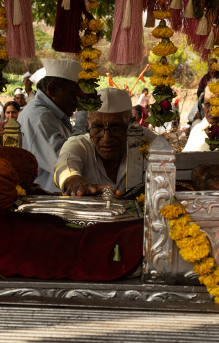 The wari plays out as a huge festival where everything from the palkhi to the rath (chariot) which carries it, the venues for their halt, and the images of Vitthal and Rukmini are dressed up to the hilt. Most Warkaris themselves though, given their limited means, are dressed in simple and unostentatious garb. What they lack in accoutrements however, they make up for in their zeal and vigour. Despite walking for tens of kilometers everyday they are never short of energy, always ready to swing to the beats of the mridangam or spin in abandonment during a game of fugdi holding on to the hands of their fellow Warkaris.
