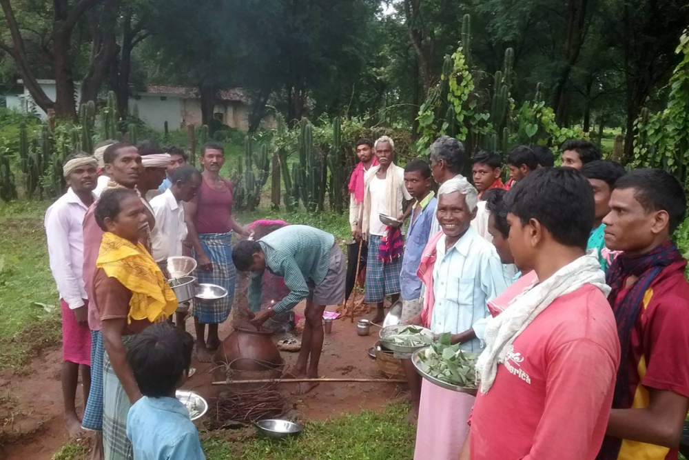 It is ensured, that the gauthan is cleaned by the people before the morning rituals start. At the gauthan, the Baiga (the village healer, who can also be a ritual head in the village) worships the animal deity, Sahada Deo. The concoction that has been prepared by the shepherd and londi are distributed among the residents by the village ritual head.