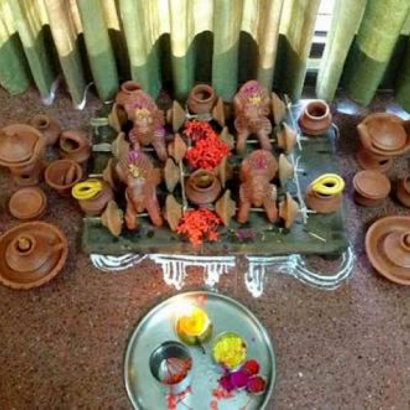 The day starts with installing a clay sculpture of an oxen, often considered to represent Nandi, which is the main idol worshiped during the ceremony.